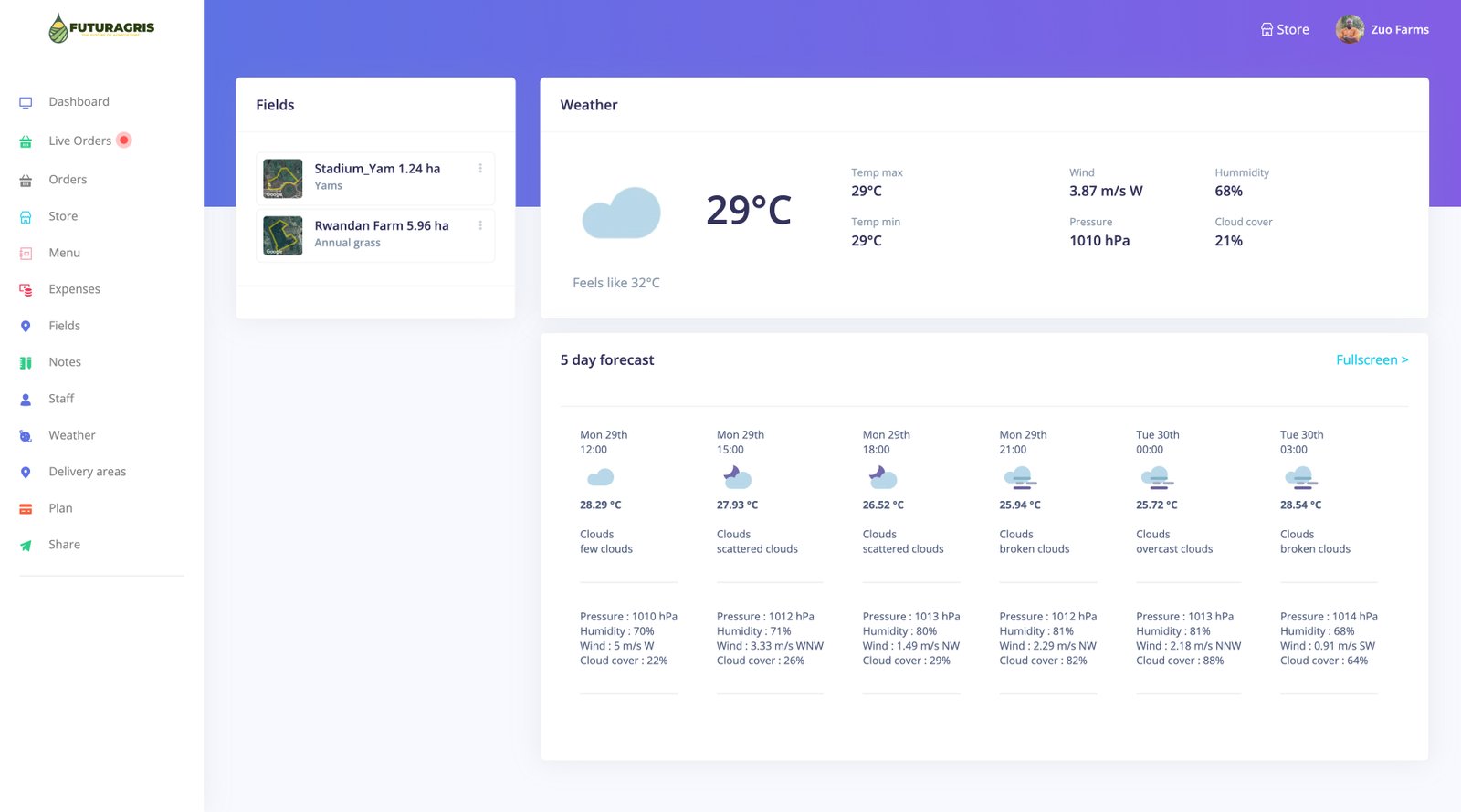 FuturAgris is a satellite-based farm management system that uses satellite imagery and data to help farmers monitor their crops and manage their farms more efficiently. This system provides real-time data on weather conditions, pest infestations, and soil moisture levels, allowing farmers to proactively address challenges and prevent potential crop damage It also enables farmers to remotely monitor their land, crops, and infrastructure